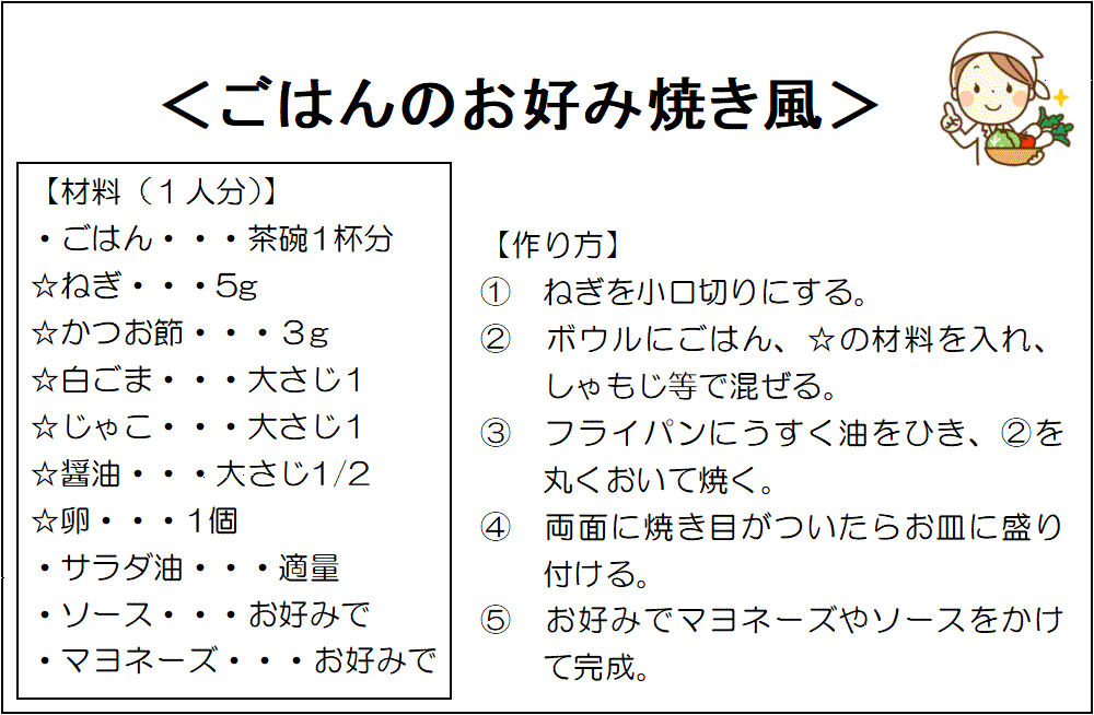 12月は「ごはんのお好み焼き風」を紹介します。